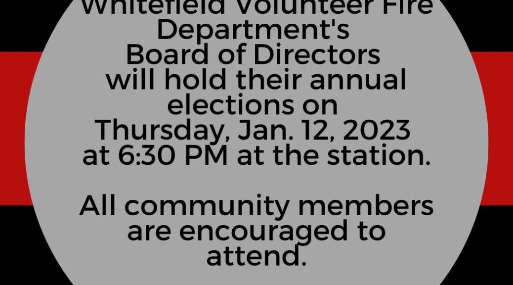 The annual meeting of the Whitefield Volunteer Fire Department will be held at the fire station, located at 4000 US Highway 29 North, on Thursday, January 25, 2018 at 7:00 PM. The purpose of this meeting is to elect board members for 2018. All residents of the Whitefield fire district are urged to attend.