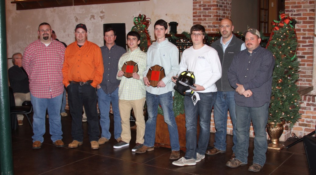From left to right… Lt. Chase Rapien, Capt. Michael Ryan, Lt. Billy Guin, Explorer of the Year Josh Guin, Firefighter of the Year Brad Guin, Black Helmet Award recipient Nick Chastain, Chief Adam Cromer and Asst. Chief Paul Drake.